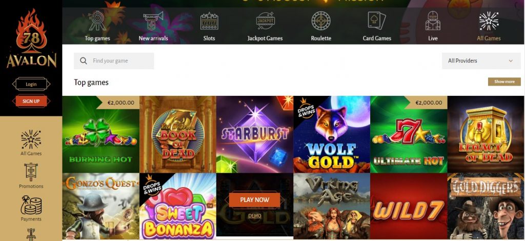 O Avalon78 Casino tem centenas de jogos para os jogadores escolherem. Isso inclui jogos de cartas, slots e jogos ao vivo. Eles oferecem muitos dos jogos mais populares disponíveis online. O ouro de lobo, a roleta de raios, a roleta automática e o livro dos mortos são alguns deles.