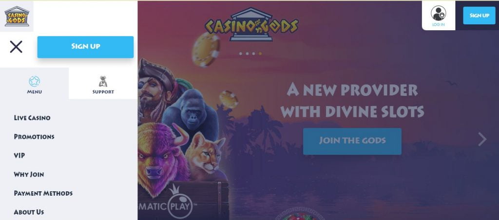 Quando os jogadores entram no site do cassino, Deus mítico prosperos com a ajuda de Fortuna e Guardiana os cumprimenta. Eles ficarão surpresos com a seleção de Jogos oferecido e os numerosos métodos de pagamento aceitos pelo cassino. Os recursos do cassino excitarão e emocionam os jogadores ao acharem a assistência de Guardiana muito útil. O tema mítico de Deus atrai os jogadores a explorar todas as aventuras que os aguardam no Deuses do cassino.