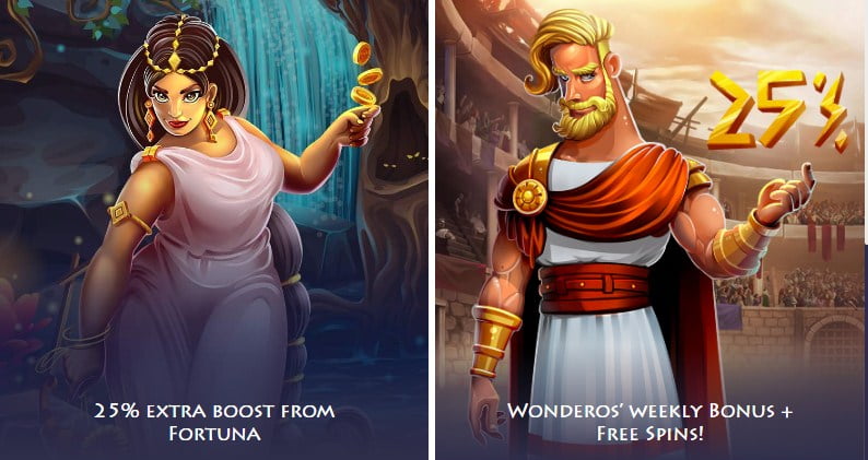Os deuses do cassino oferecem Novo cassino jogadores a Bônus de boas -vindas no valor de US € 1.500,00 mais 300 cem Giros grátis a ser pago nos quatro primeiros depósitos. O primeiro depósito é uma correspondência de 100% até US € 300 e um mínimo de US € 10 com as 300 rotações gratuitas. O segundo depósito redes 50% do depósito de até US € 400, e o terceiro e o quarto depósitos obtêm 25% de correspondência de até US € 400. Wonderos, a deusa também oferece semanalmente e mensalmente Bônus Para todos os jogadores. Os jogadores devem apostar nos quatro primeiros depósitos 40x antes de poder retirar quaisquer ganhos. 30 dos giros gratuitos aumentam sua conta após o primeiro depósito. Enquanto você obtém o restante à taxa de 30 por dia nos nove dias seguintes.