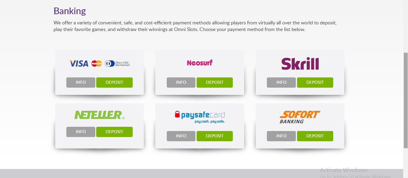 Depósitos e bancos no site Omni Slots são todos feitos através do painel de contas para o jogador. Os jogadores que vêm a este site se apaixonam pela página do painel porque podem ver em quais jogos apostaram, quanto dinheiro ganharam e todas as suas transações.