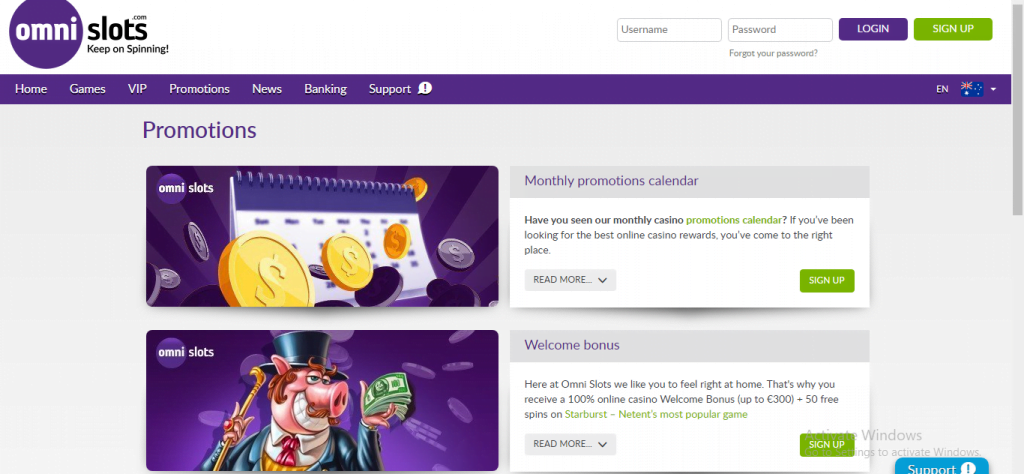 Os slots Omni são muito generosos quando se trata de bônus e promoções. Todos os novos clientes recebem 100% Bônus de boas -vindas em seu primeiro depósito até US € 300. Eles também dão 50 Giros grátis Para o jogo de slot Starburst. É o slot mais popular feito por gigantes Netent. O bônus é creditado automaticamente após o primeiro depósito. Faça uso desse dinheiro para jogar mais jogos e tente ganhar mais dinheiro.