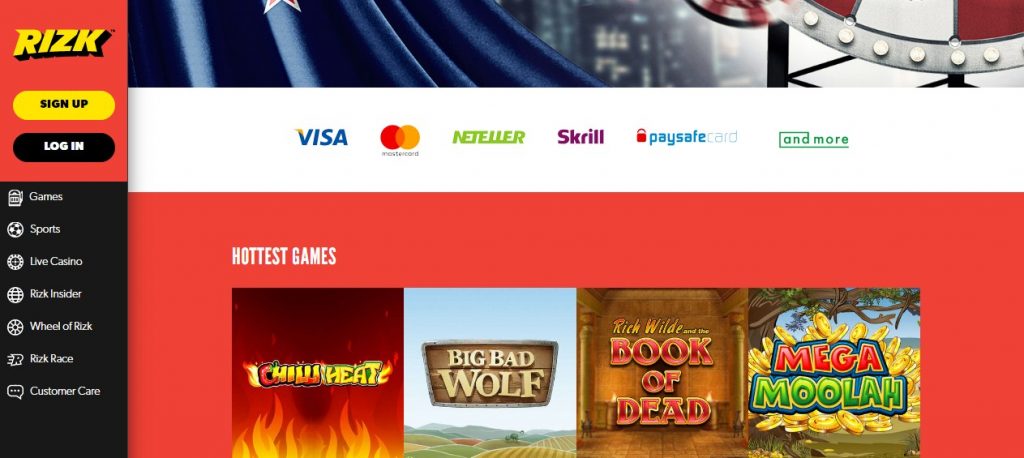 O cassino exibe o menu para facilitar a navegação na barra lateral esquerda. Ele contém botões para todas as seções importantes que fornecem todas as informações necessárias sobre o Rizk Casino. Isso inclui inscrição, login, jogos, esportes, cassino ao vivo, insider Rizk, roda de Rizk, Rizk Race e Customer Care.