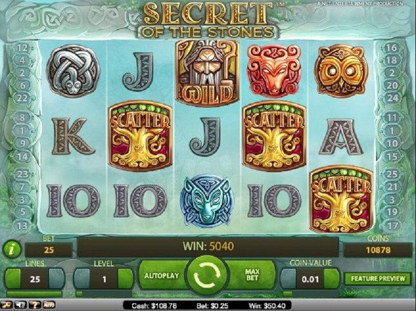 Jogo - existem cinco rolos, e o jogador pode apostar até 25 linhas. Como a maioria dos jogos de slots, símbolos combinando significam uma vitória. Um jogador vai receber dez Giros grátis Se três símbolos de dispersão aparecerem em qualquer lugar nos rolos. O recurso de spin gratuito é provavelmente a parte mais agradável do jogo Secret of the Stones e um jogador pode coletar bônus diferentes, como; Mais rodadas, multiplicadores, símbolos selvagens e até 2 bobinas selvagens.